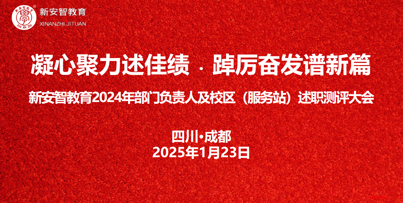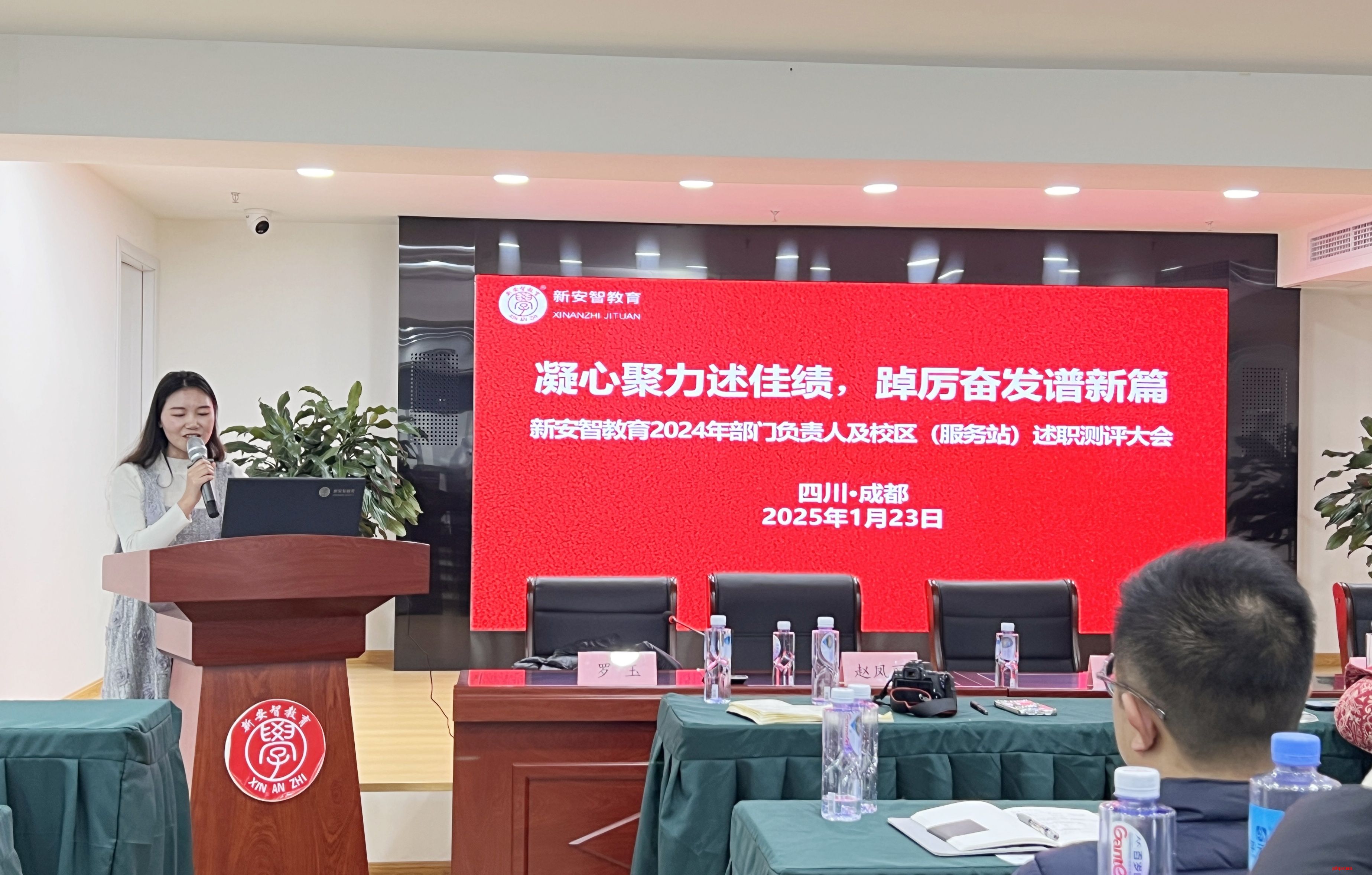 2025年1月23日上午,新安智教育在成都总部学术交流中心成功举办了2024年下半年部门/校区负责人述职大会。新安智教育理事会成员、各部门/分校区负责人以及成都总部工作人员出席会议,新安智各校区工作人员通过线上平台同步收看直播。大家共同回顾过去一年的辛勤耕耘,并展望未来的宏伟蓝图。会议在“凝心聚力述佳绩,踔厉奋发谱新篇”的主题下,展开了深入而富有成效的讨论。