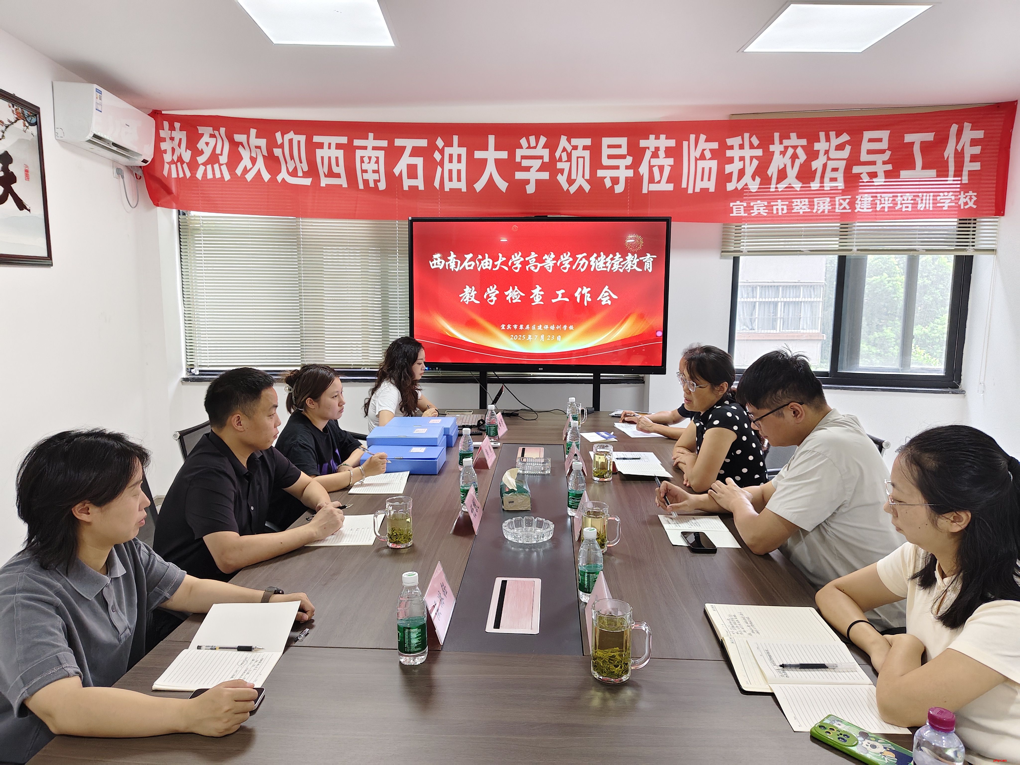 2025年7月23日上午,西南石油大学继续教育学院领导及检查组一行莅临我校宜宾建评教学点,对高等学历继续教育教学工作进行了全面细致的专项检查与指导。此次检查旨在深入了解教学点运行状况,规范教学过程,提升办学质量,确保高等学历继续教育健康有序发展。检查工作通过听取专题汇报、查阅档案资料、实地考察走访等多种形式展开。检查组重点围绕教务管理规范落实、学员学习过程反馈、师资队伍建设与助学服务效能等核心环节,进行了深入细致的核查与评估。我校宜宾建评教学点负责人张本芳、教务负责人郭艳及相关管理人员全程陪同,并就教学点的整体运行情况、特色做法及未来规划向检查组作了详尽汇报。